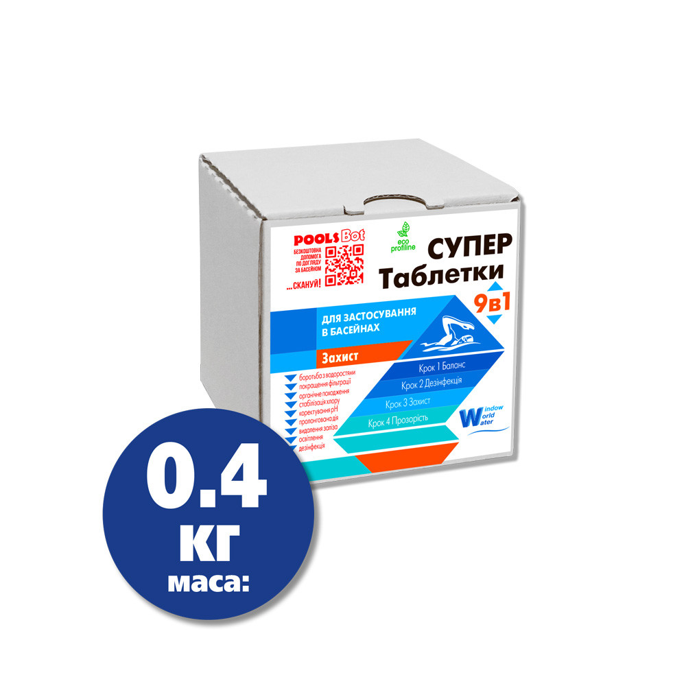 Повільно розчинний препарат в таблетках на основі хлору для комплексної та тривалої дезінфекції води в басейні. Одна таблетка містить три діючі речовини: